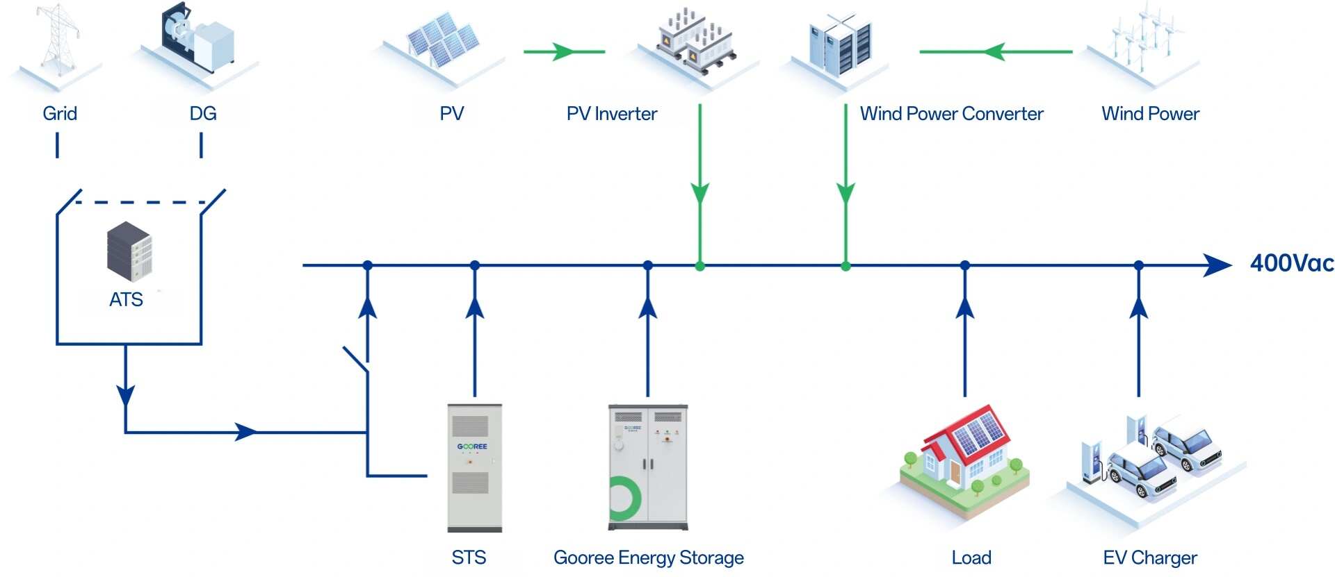 To handle complex loads and fluctuating energy conditions, Gooree Energy designed a multi-energy complementary system integrating Solar PV + Energy Storage + Diesel Generator + Load + EMS, achieving dynamic balance and intelligent energy coordination.